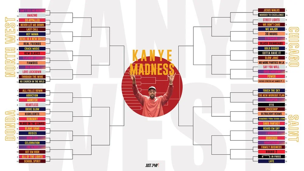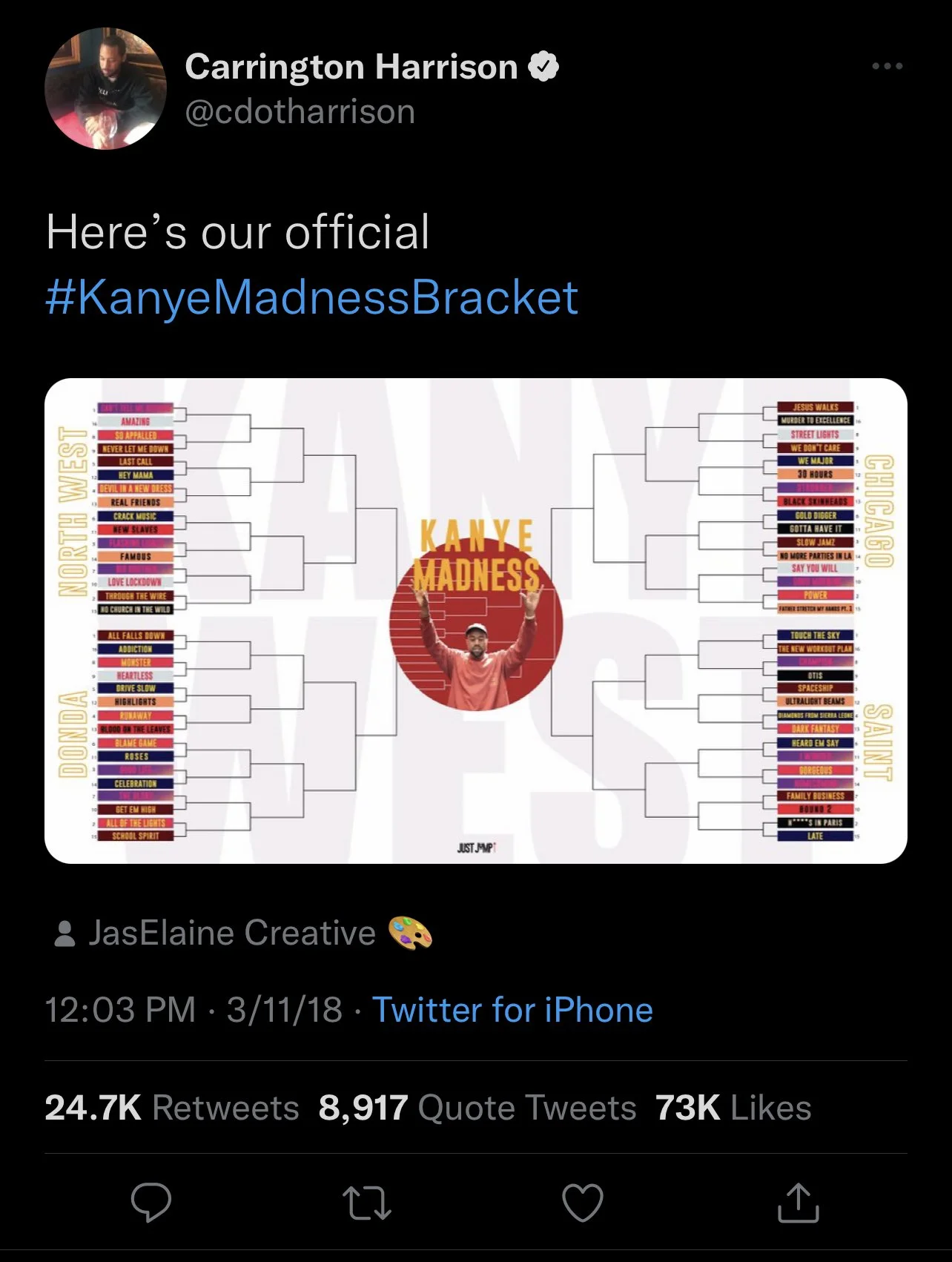 Myself and a small group created the viral sensation #KanyeMadnessBracket which blew up in March 2018. I personally concepted and created the design of the bracket based on Kanye West’s album art over the course of his discography. With over 109.4K engagements on the original tweet alone, the subsequent bracket polls garnered a total of 3,558,473 votes. The story was picked up by publications like ESPN, Complex Magazine, MSNBC, The Kansas City Star, and a number of others. It bracket was discussed on countless podcasts like Everyday Struggle and continued to be discussed across various mediums for weeks following. The bracket was a HUGE sensation, with printouts popping up in coffee shops and music stores all over America. Adapting brackets for various other topics became a trend that continues to be picked up and used today by top brands and pop culture.